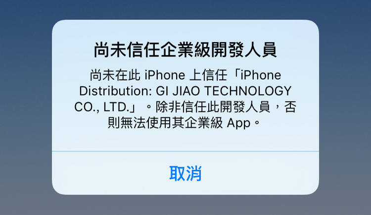 因 iOS9 的安全性更新,需進入設定裡面點選信任後才能開始使用。